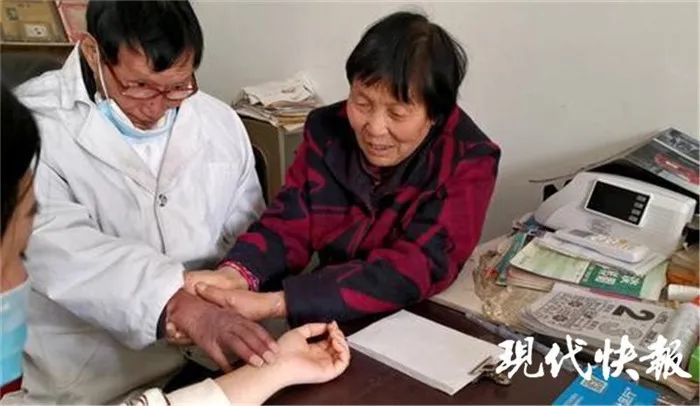 妻子扶著張又今的手幫病人搭脈。圖片來源:現(xiàn)代快報(bào)