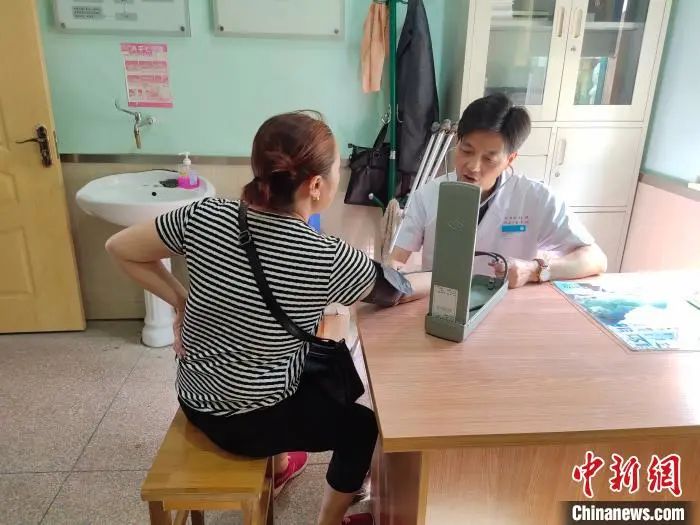 范虎勇(右)為村民測量血壓。圖片來源:中國新聞網 宋英杰攝