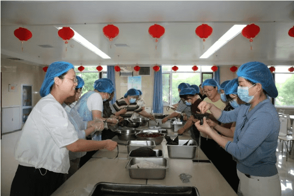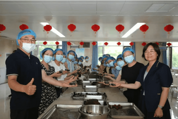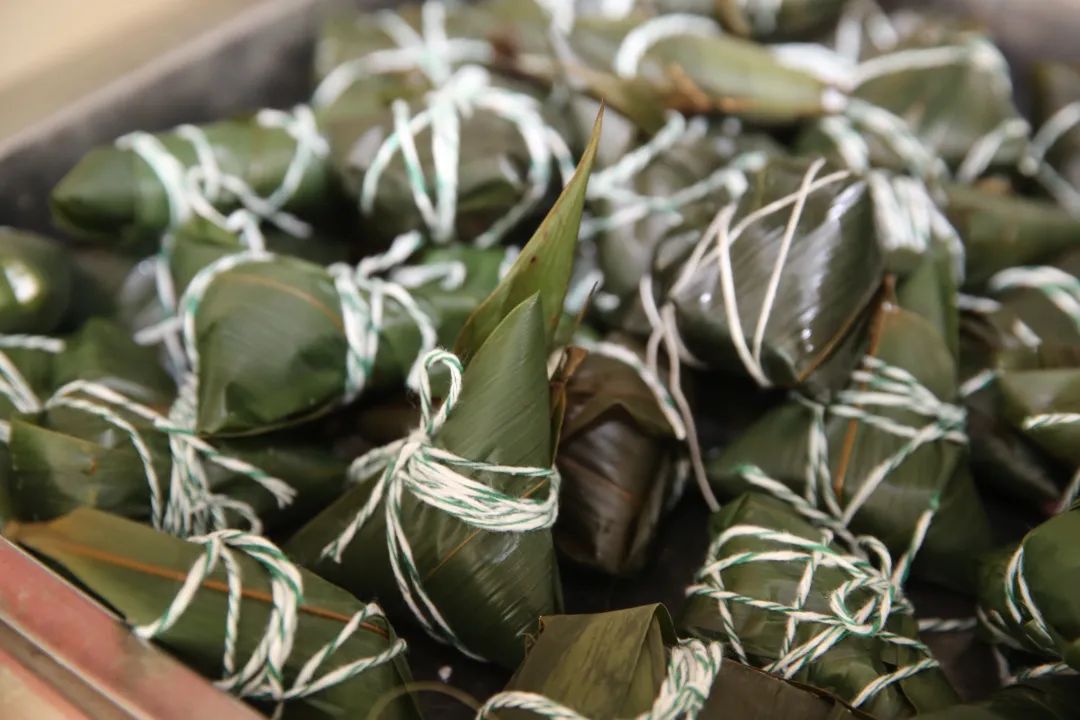 職工餐廳里,工作人員早早準(zhǔn)備好了糯米、紅棗、粽葉等食材,大家圍在一起,捋粽葉、做漏斗、填糯米、壓緊實(shí)、封口、扎捆,巧手翻飛間,一個(gè)個(gè)碧綠飽滿的粽子“新鮮出爐”,盡管形狀各異,但每一只都包裹著滿滿的心意。老手耐心示范,新手認(rèn)真模仿,歡聲笑語中,傳統(tǒng)文化的溫度悄然流淌。