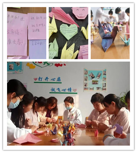 關(guān)于千紙鶴,有許多美麗的傳說,開始時人們相傳折千紙鶴能祈禱得病的人早日痊愈,如今,千紙鶴已經(jīng)成為了希望的象征。春節(jié)期間,女病區(qū)組織了“共疊千紙鶴,書寫心期盼”活動,留院患者將自己的新年愿望寫在彩色的折紙上,再疊成一只只美麗的紙鶴,承載起滿滿的新年祝福和愿望。